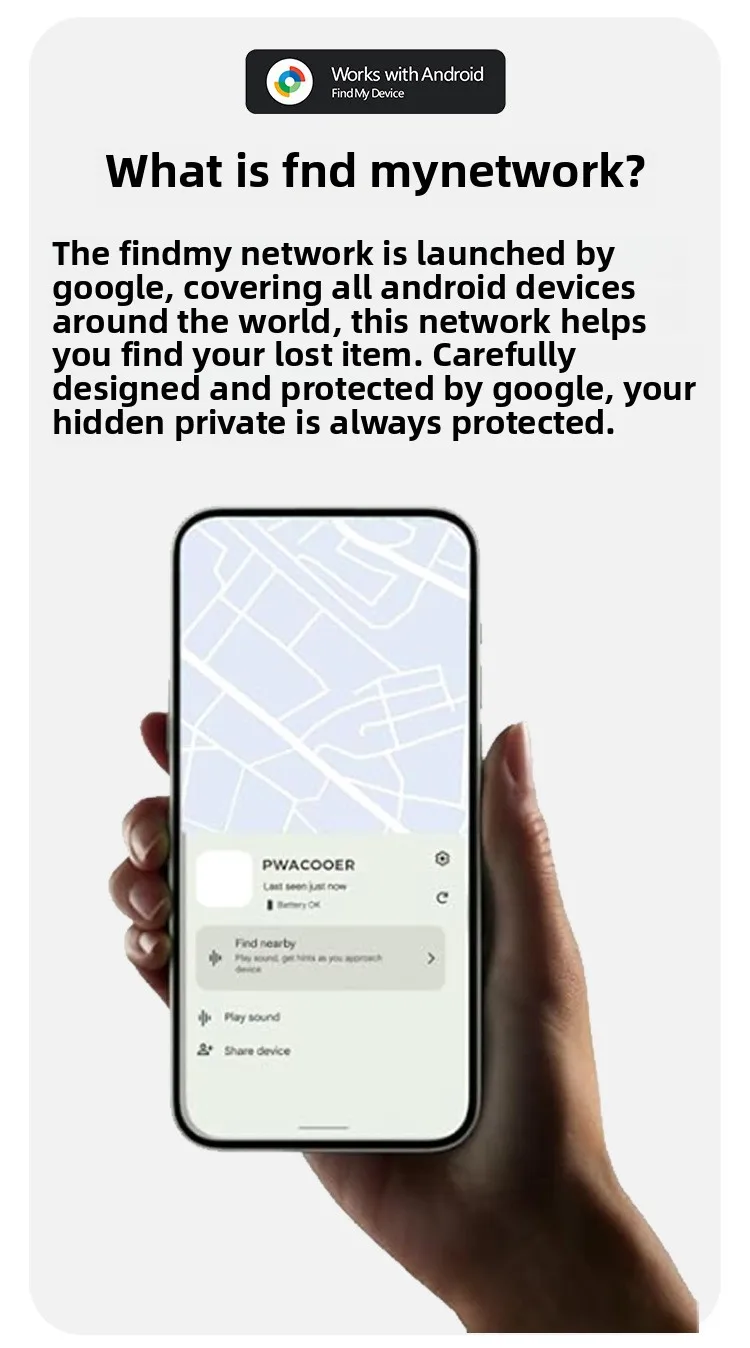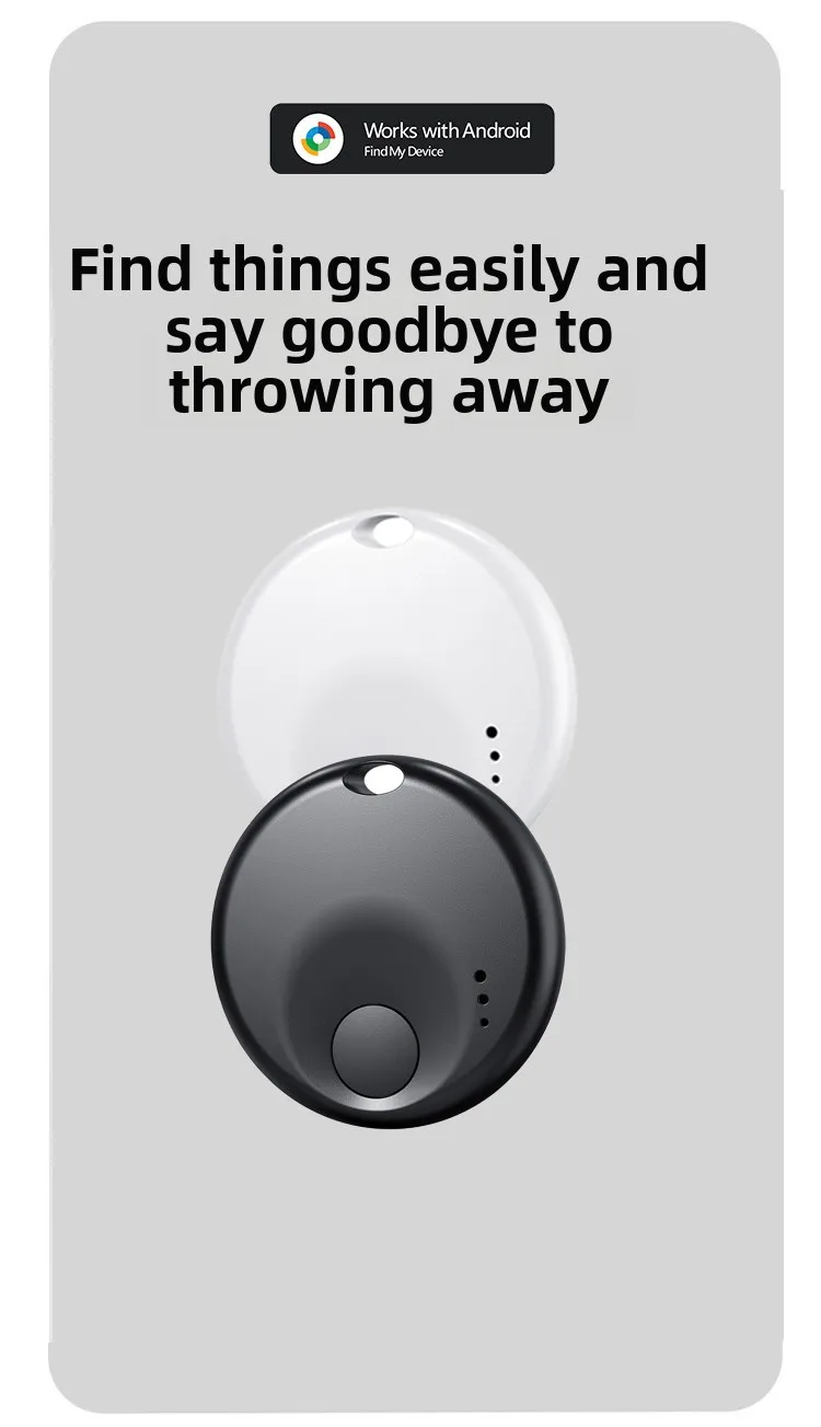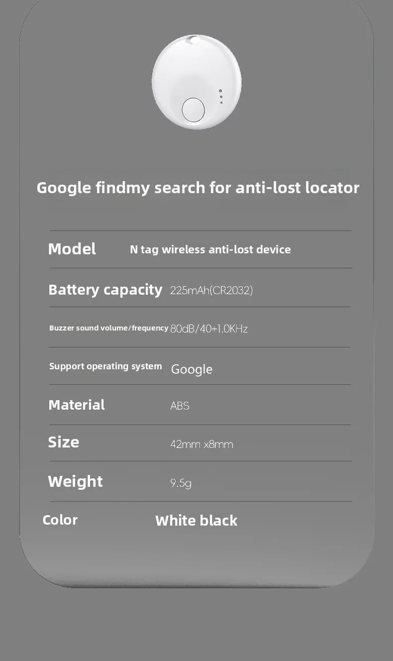 SpecificationProduct Size: ≈42×42×8mmProduct Weight: ≈9gItem Tracker: PC+ABSWorking Voltage: 2.6V~3.6VWorking Temperature: -20℃~60℃Power Consumption: Maximum 9.5mAh In Advanced Mode, Average 22ua In Pairing ModeBattery: CR2032 Non Rechargeable Button BatteryFeature• Google Certified Product• Integrated with Google Find My Device• Global positioning coverage• Privacy Protection• IP67 Waterproof Rating• Long-lasting Replaceable BatteryDescription1. Reliable Protection, Anytime.The Android Smart Anti-Loss Device seamlessly connects with your phone. Just open the app to instantly locate any lost items. With the new, com pact design, it's there to protect, so you can live worry-free.2. Rediscover Important Moment.Forgot your wallet or lost your keys? The new Android Smart Anti-Loss Device gives you peace of mind! Easily track your items with your Android device and safeguard your essentials anytime.3. Track Everything, Anywhere!Say goodbye to losing things. The new Android Smart Anti-Loss Device helps you track all your valuables, even when they're out of sight. With worldwide tracking, it's perfect for travel.NotePlease use it with Google Find My APP Device.Please confirm that your phone can download the Google Find My Device APP before placing an order. Thank you.This tracker basically works like AirTags. It needs to update the location effectively when there are other Android phones nearby, and the phone must also register or use Google Find My Device to report the last tracker location to you.